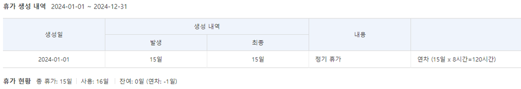 2023년 11월 1일에 입사하고 2024년 8월 7일? 8일? 에 퇴사 예정인데, 이미 근태 관리에는 연차 15일이 부여된상태입니다. 하지만 1년 이하 근무로 인해 월차만 생기기때문에 9일 휴가가 맞긴한데, 휴가현황에는 15일이 있고 사용휴가는 16일 입니다.