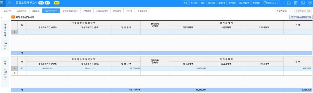 종합소득세 결손금 이렇게 입력하면 되나요?결손금은 2024년 결손금입니다.(2024년 종합소득세 신고 중)당기순이익 : -68,776,070타소득 소득금액 58,810,141잔액이 사용한 뒤에 9,965,929원이 남도록 이렇게 당기 꺼 작성하면 될까요?