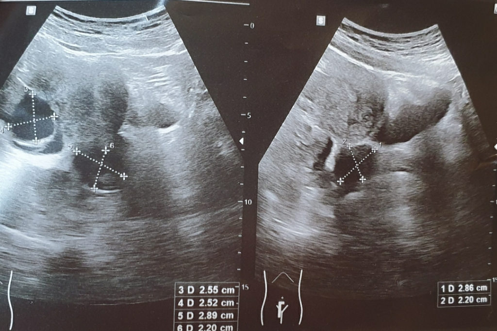 내과를 가서 복부초음파 했는데요 (아래 사진) 아랫배쪽에 물혹이 두개가 보이신다고 하시더라구요. 하나는 난소물혹인데 하나는 자궁경부쪽 으로 보인다고 하셨어요.
