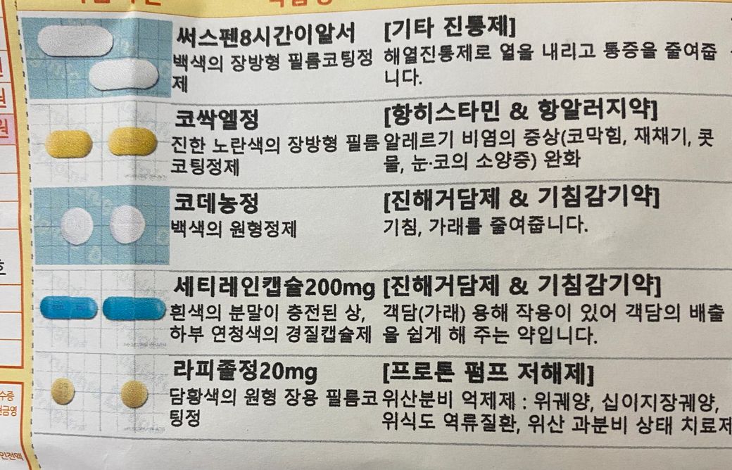 써스펜서방정/ 코싹엘정 / 코데농정 / 세티레인캡슐 / 라피졸에는