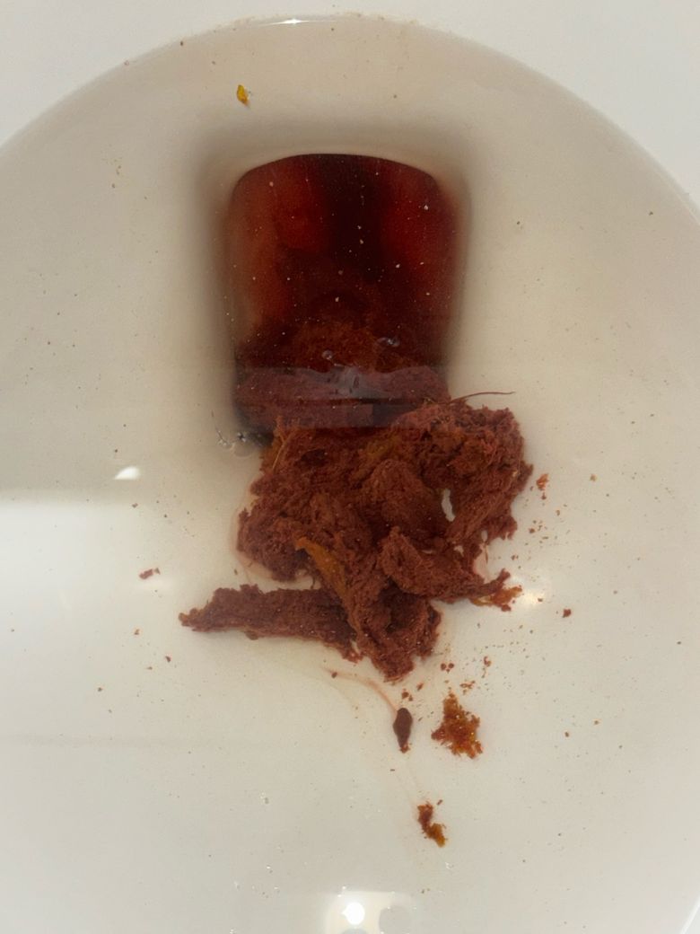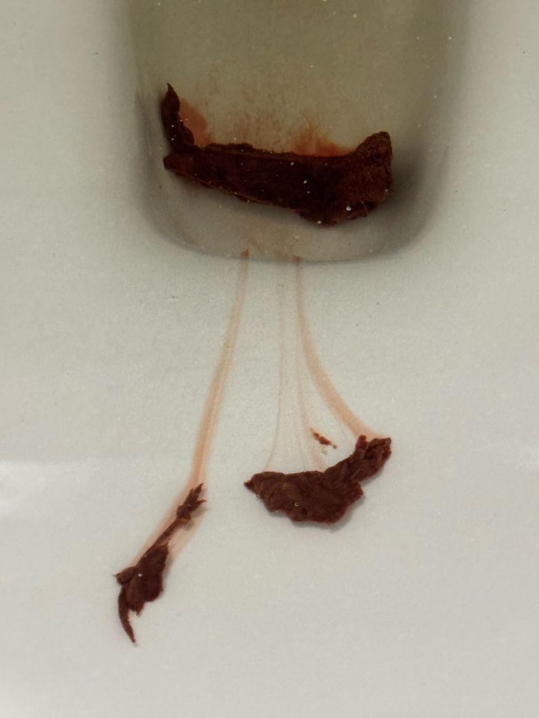 휴지로 닦았을 때, 첫 휴지는 사진에 있는 변과 똑같은 제형과 색이었고요. 닦을수록 정상적인 변의 색으로 변했습니다.
