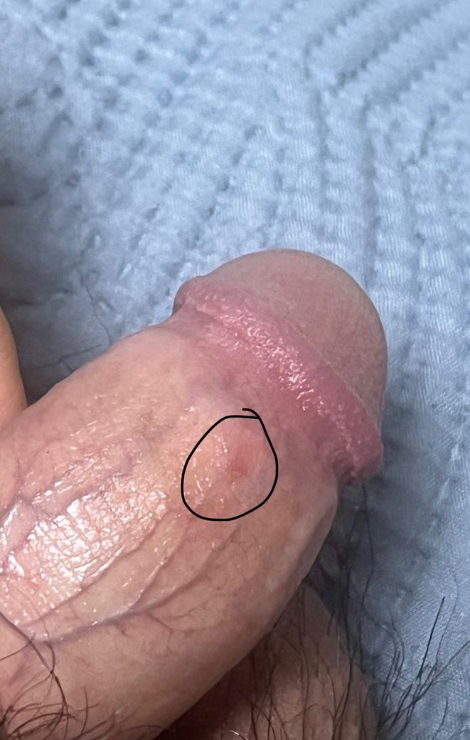성기 기둥에 빨간 자국이 보이는데 통증이나 그런건 전혀 없는 상태입니다. 사진에 표시한 부분만 빨개보여서 걱정입니다. 정상 상태인가요?