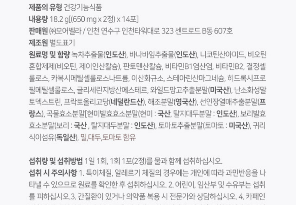 수유부인 경우 카페인의 하루 섭취량을 약 200~300mg 정도로 조절하는 것이 좋은데, 건강기능식품은 의약품처럼 성분이 자세히 나와있지 않으므로 명확한 판단은 어렵지만, 하루 권장된 용법으로만 복용한다면 별다른 문제는 없을 것으로 보입니다.