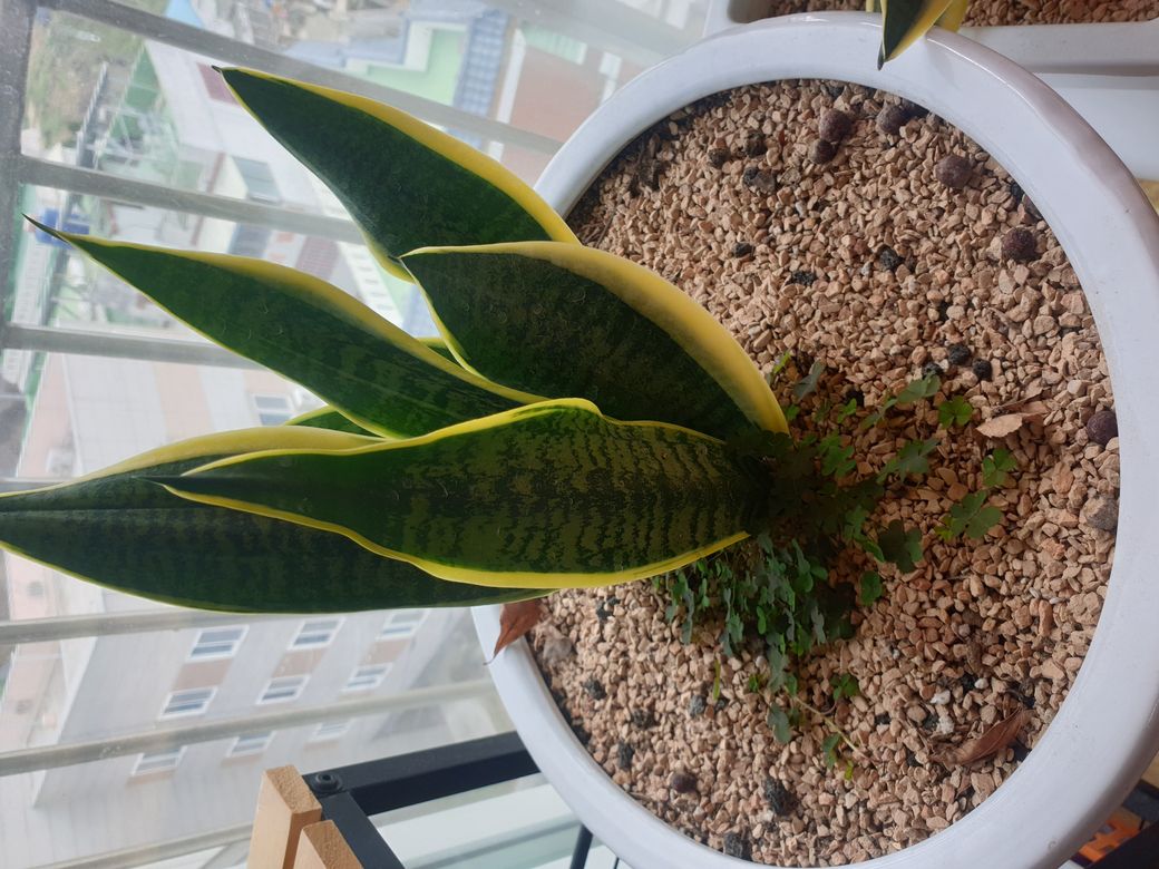 저희집 산세베리아에 세잎클로버가 같이 있어요 처음에 클로버가 생겨서