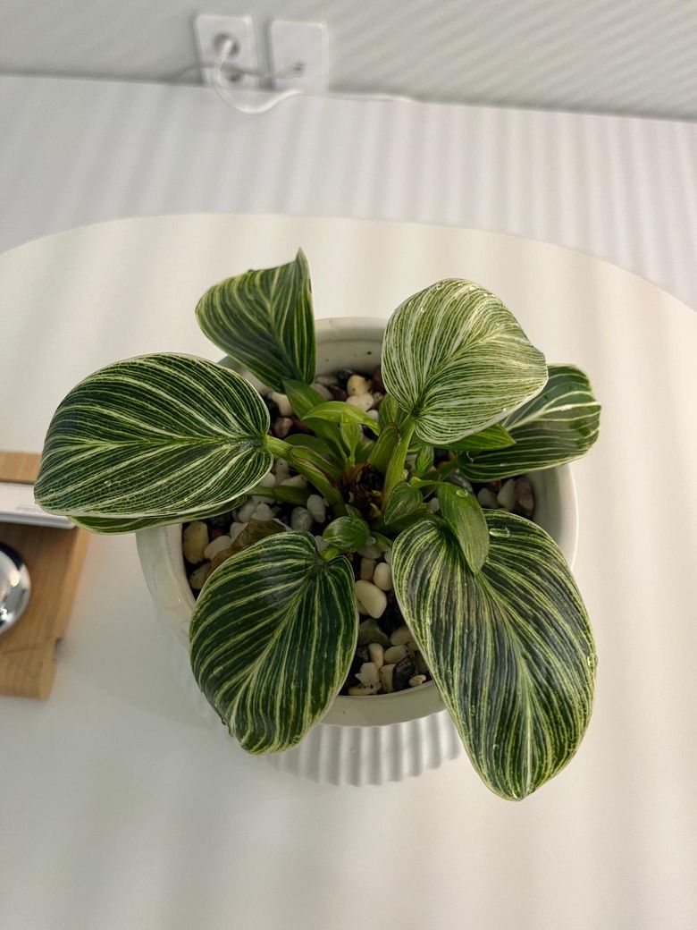 사진으로 올려주신 식물은 공기정화 기능이 있고 녹색잎에 흰선이 매력이라고 하는 "필로덴드론 버킨" 입니다.