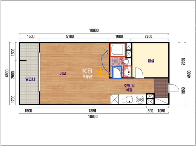 사진에 나온대로, 세면대를 욕조쪽 위치로 옮기고(도면 상에는 욕조로 나와있는데, 실제로 욕조는 없고 샤워기만 설치돼있습니다),