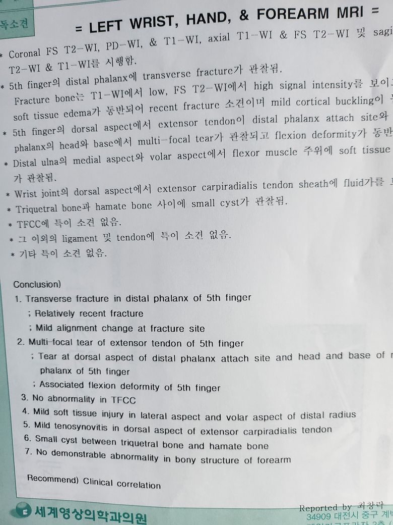 손가락 손목MRI 판독지 해석좀 부탁드려요??.??