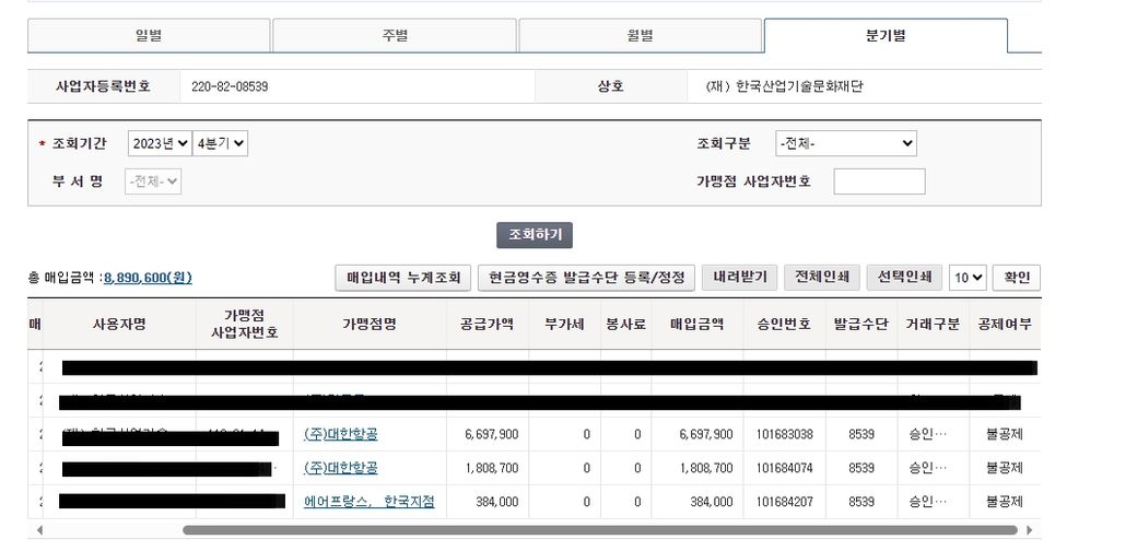 문의드립니다. 국세청 현금영수증 받은내역은 아래와 같습니다.