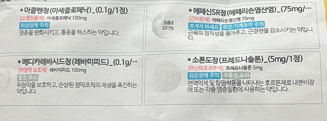 처방된 정형외과 약에 진통소염제가 포함되어 있기 때문에 탁센캡슐을 함께 복용시 중복으로 인해 부작용이 나타날 수 있어 권장하지 않습니다.