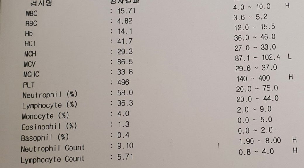백혈구 수치는 정상 수치의 1.5배 정도로 높게 나온 상태이며 염증수치도 정상범위보다 높습니다.