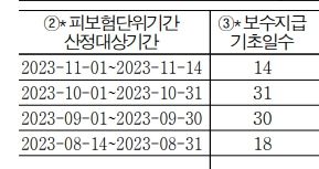 작년 2023년 8월~11월에 근무했던 곳의 피보험단위기간 산정입니다 여기는 근로계약서에는 어떻게 적혀있는지 모르겠으나 분명 주5일제였습니다만 보시다시피 토,일 상관없이 주7일 전부 계산되었습니다. 세무사가 해준거구요. 이때는 전직장과 합산하여 실업급여를 받았었습니다