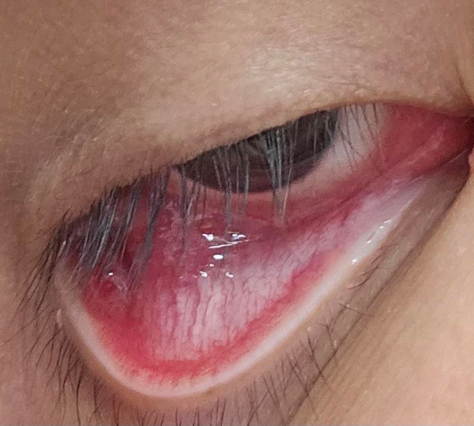 뭘 말씀하시는지 사진만으론 확인이 불가하네요. 눈꺼풀에 보이는 병변은 없고 눈 안쪽은 속눈썹에 가려져서 안보여요