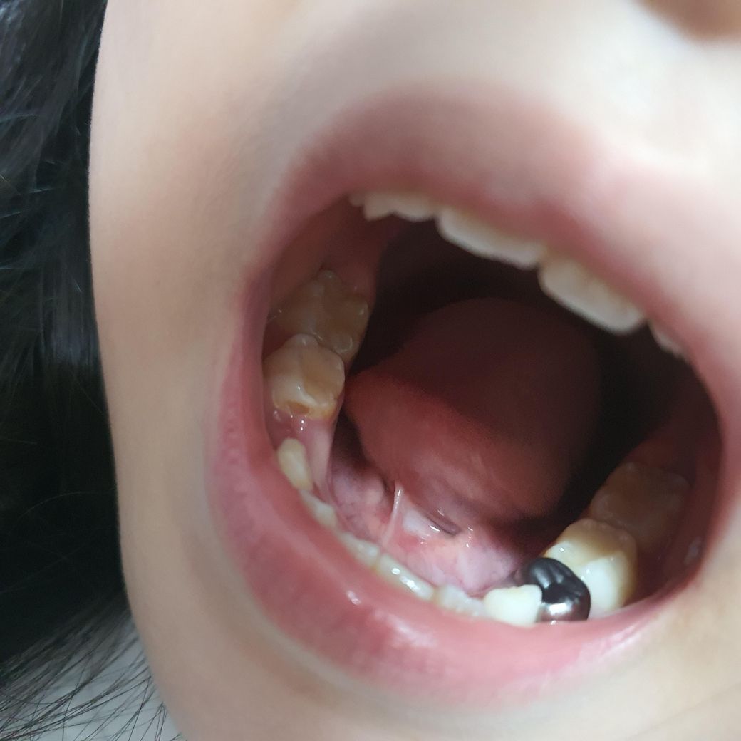 네 유치 어금니 옆면 충치, 부식이네요 아직 영구치 교환까지 1년이상 남았다면 치료해주면 좋을것 같습니다