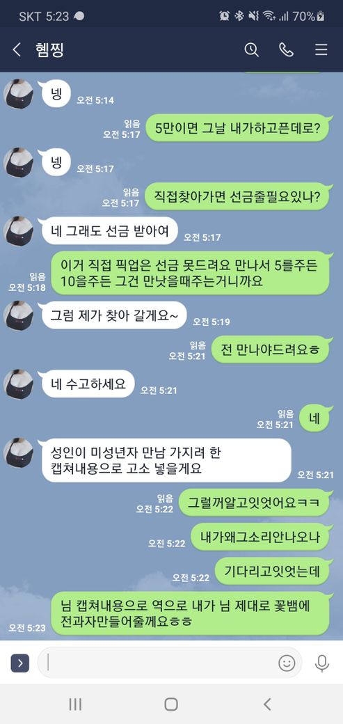 청소년인걸알면서 제가 메신저를한이유 게임에사기가많아서 호기심겸 혼내줄라고했는데 선입금하길래 선입금안한다니까
