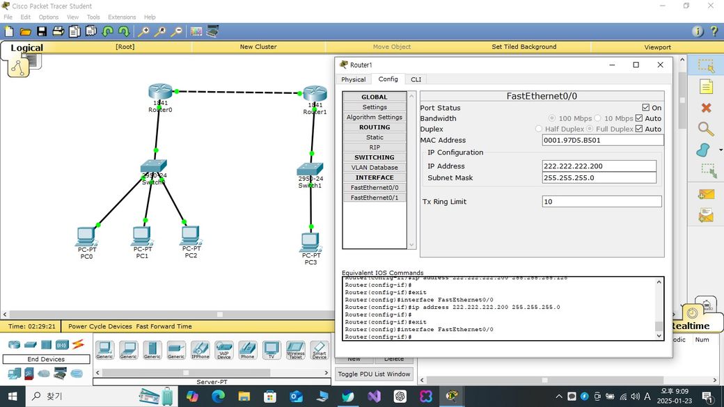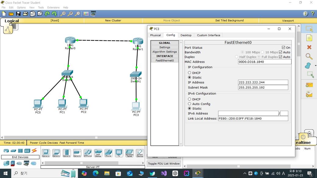 제가 라우터의 서브넷을 128로 줬었던 점은....라우터 하단에 PC를 두대 두어서 네트워크를 두개로 두고..