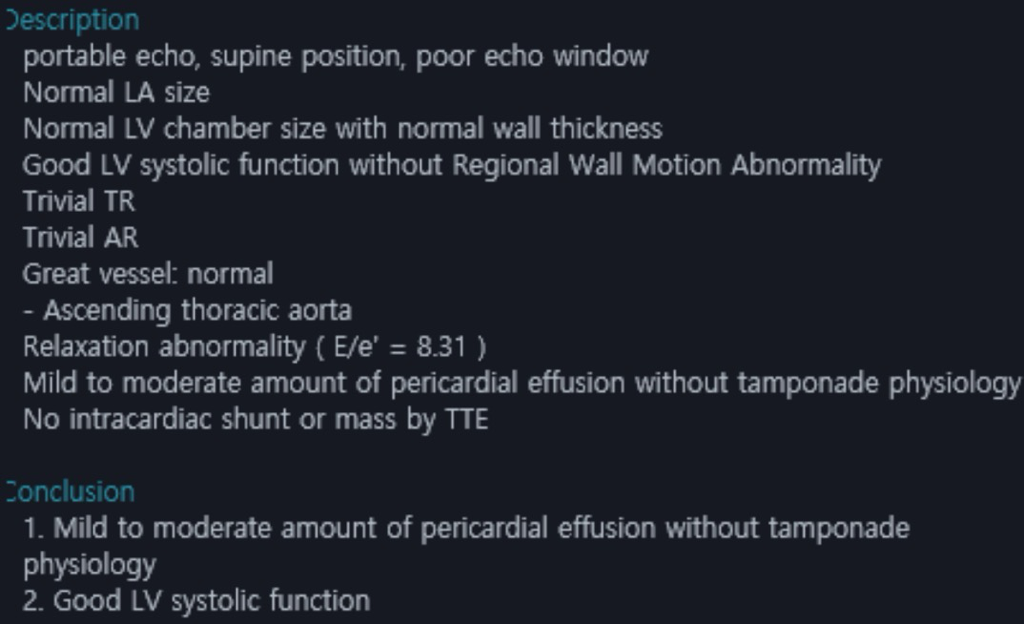 Mild to moderate amount of pericardial effusion without tamponade physiology: 적출증 없이 경미에서 중등도의 심낭 삼출액이 있음.