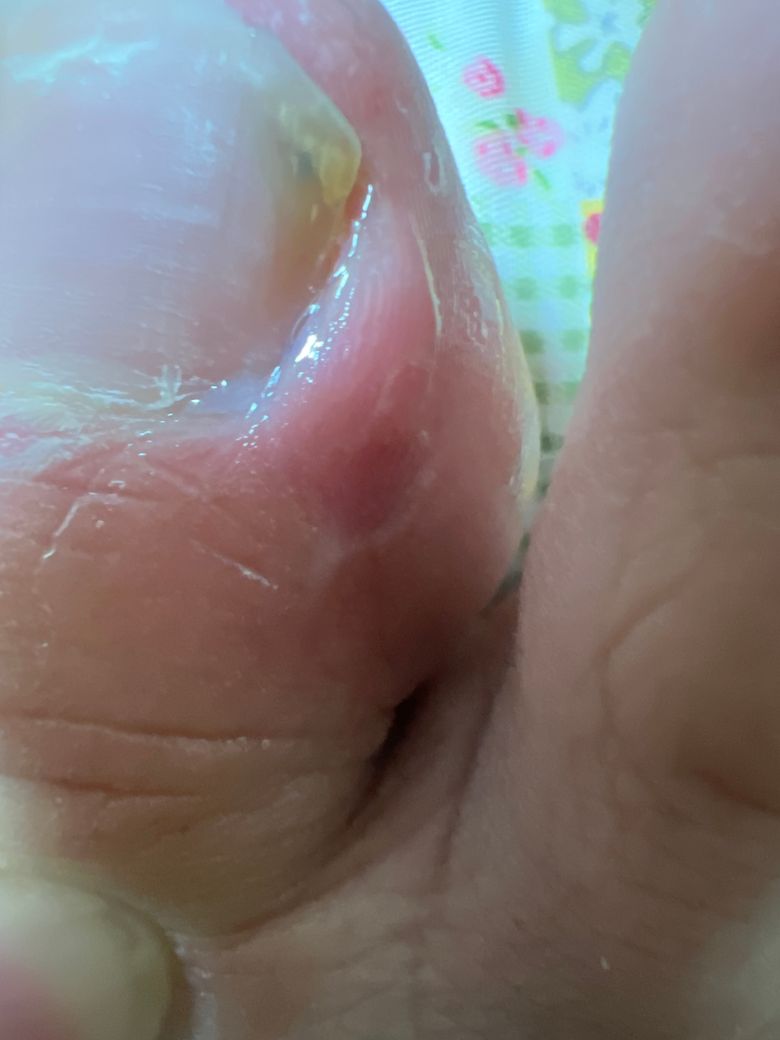사진처럼 엄지발가락 발톱이 살을 누르지 않는데도 옆 피부가 빨갑게 부어올라왔어요 걸을때마다 통증이 있어요 이게 대체 뭔가요? ..
