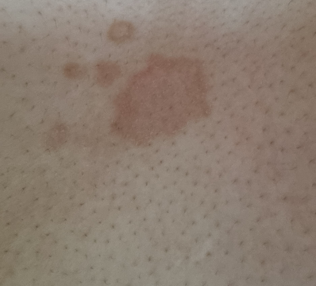약간 가렵지 않나 싶습니다. 사진만 봐서는 어루러기 같습니다. 몸에 생기는 무좀이고 여름처럼 땀이 날때 심해지지요. 정확한 진단과 치료를 위해 피부과에 가보시기 바랍니다.