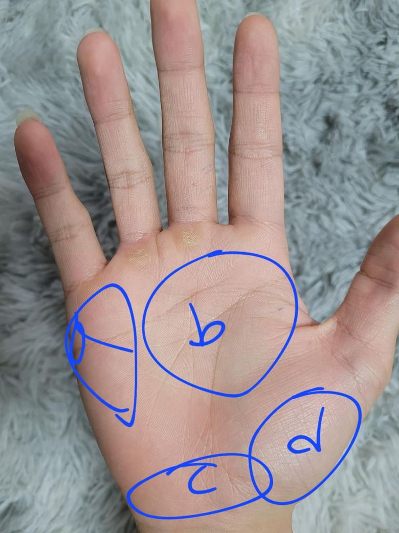 푸시업에서 정답은 손바닥 전체로 균등하게지만 핵심은 B입니다. B는 손바닥 중앙~엄지 쪽 볼록한 부분으로 가장 중요한 부분입니다. 손바닥 전체로 바닥을 밀어낸다는 느낌으로 하시되 특히 엄지 뿌리(B)+검지쪽에 힘을 주시고 손가락은 바닥을 살짝 움켜쥔 느낌으로 하세요