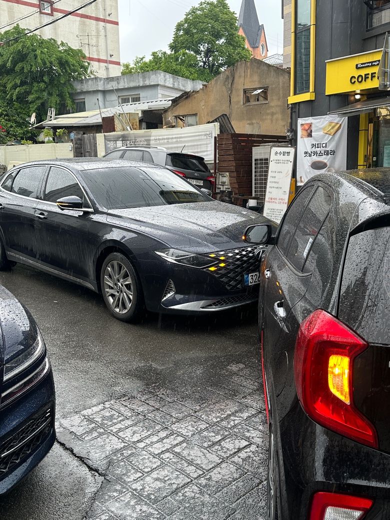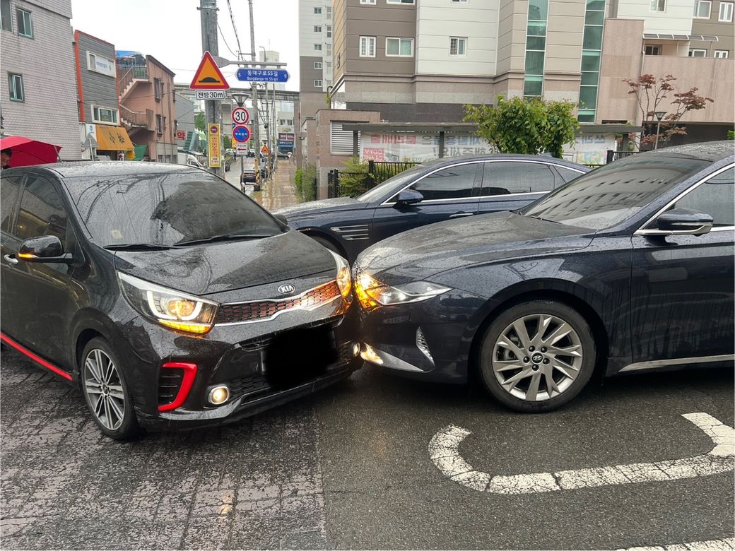 제가 피해차량(그랜저)인데 우측 좌회전차량(모닝)이 다소 빠르게 다가오고 있었습니다. 저는 서행하고 었어서 제가먼저 브레이크 밟고 멈췄고, 1-2초 뒤에 모닝이 저를 박았습니다.