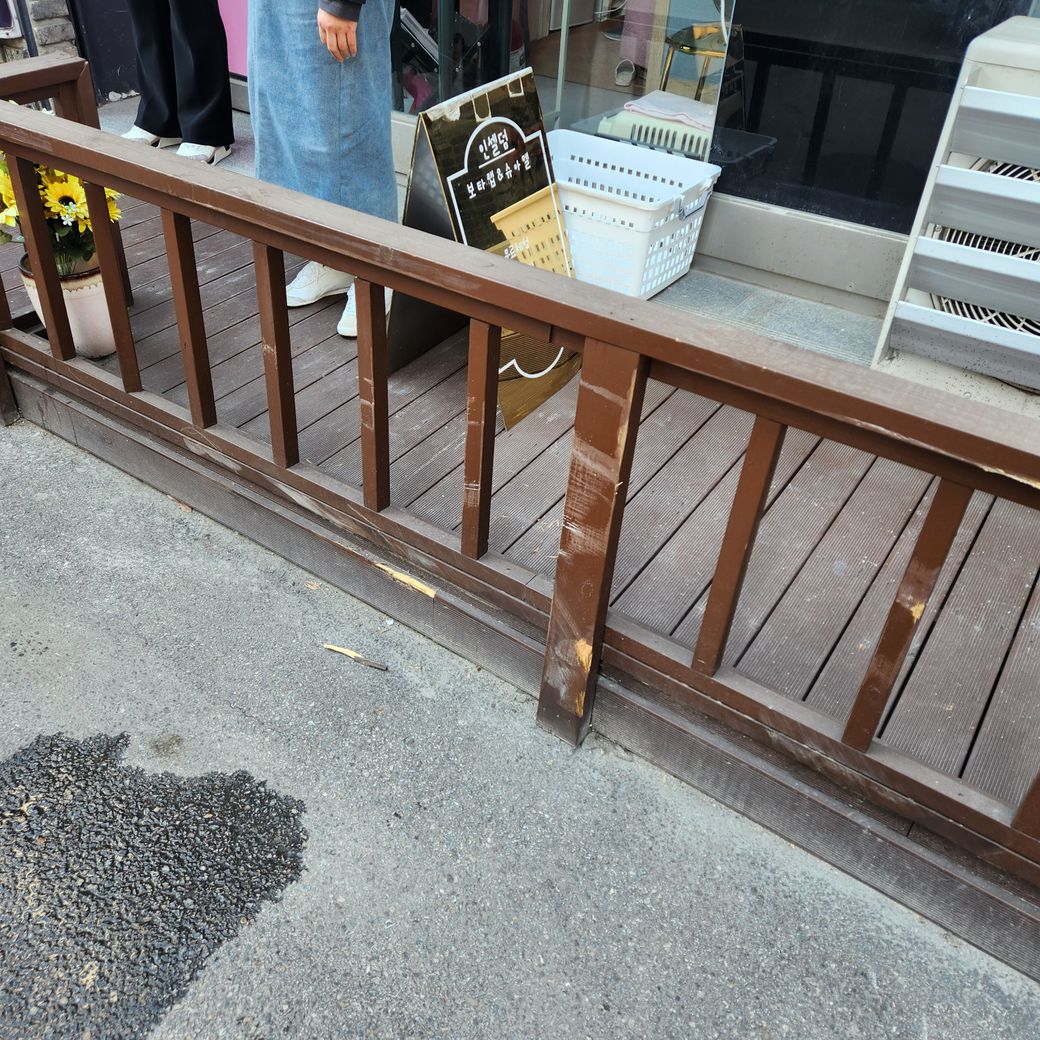 목재로 연결된 데크 난간 부분에 충돌이 난 것이라 부분교체를 할 경우, 사후에 흔들림이 발생할 우려가 있고 아무리 동일 색상으로 칠해도 색상차이가 발생해 미관이 저해될 것이 우려되는데요.