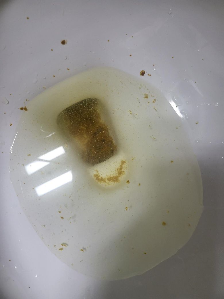 지방이 조금 뜨는것 같기는 하네요. 중요한것은 지방변의 가장 흔한 원인은 음식이라는 거죠. 췌장에 문제가 생기려면 지방변 보다는 복통이나 체중감소가 나타납니다. 지방변만으로 추가적인 검사를 고민하지는 않습니다.