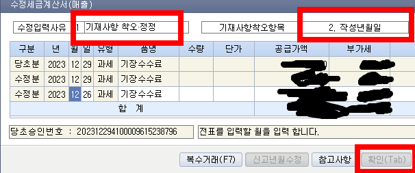 매출세금계산서 작성일자 기재사항 착오 정정으로 수정세금계산서를 더존 스마트에이에서 발급하려 하는데