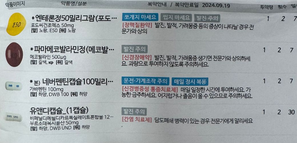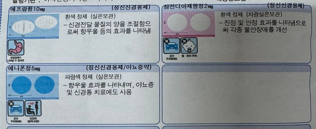 세 번째 사진의 약물 중 디아제팜과 에나폰은 약물간 상호작용이 많은 편이어서 30분 이상 간격을 두고 복용하는 것이 좋습니다.