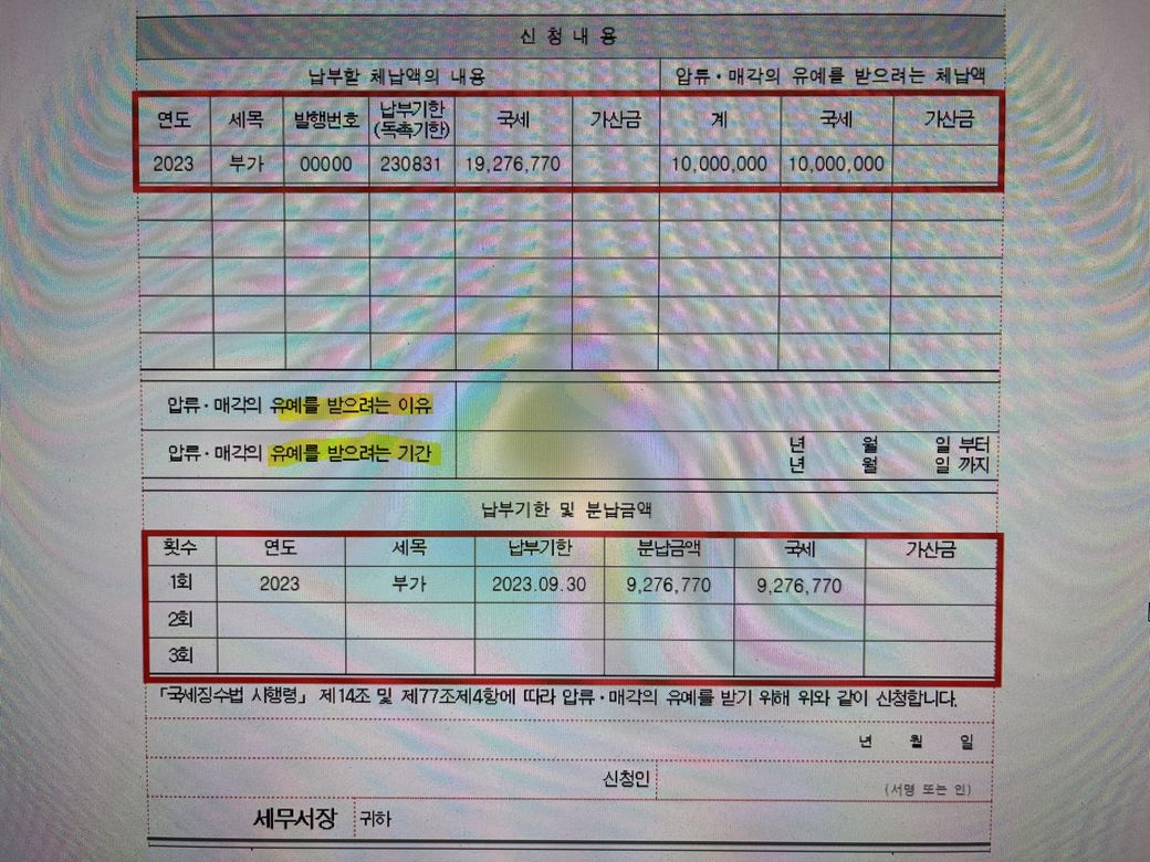 체납액 중 1천만원은 나중에 납부하겠다는 유예를 신청하는 것입니다.