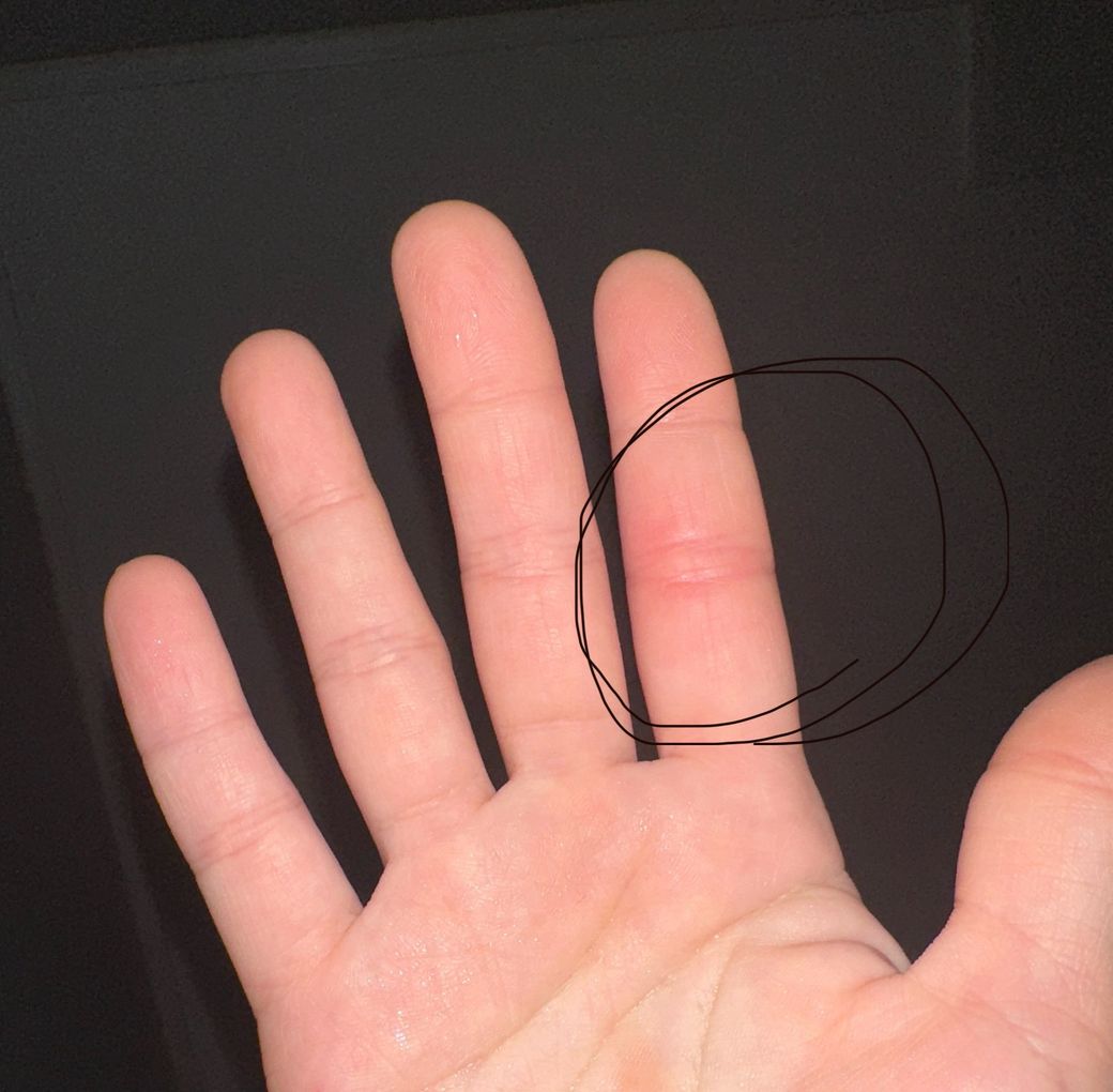 아침에 자고 일어나니 오른쪽 손을 쥐고 펴는게 약간 뻣뻣해서 손을 보니 오른쪽 검지손가락이 유난히 붓고 손바닥면으로 보았을 때는 손가락 마디에 붉게 얼아와있습니다.