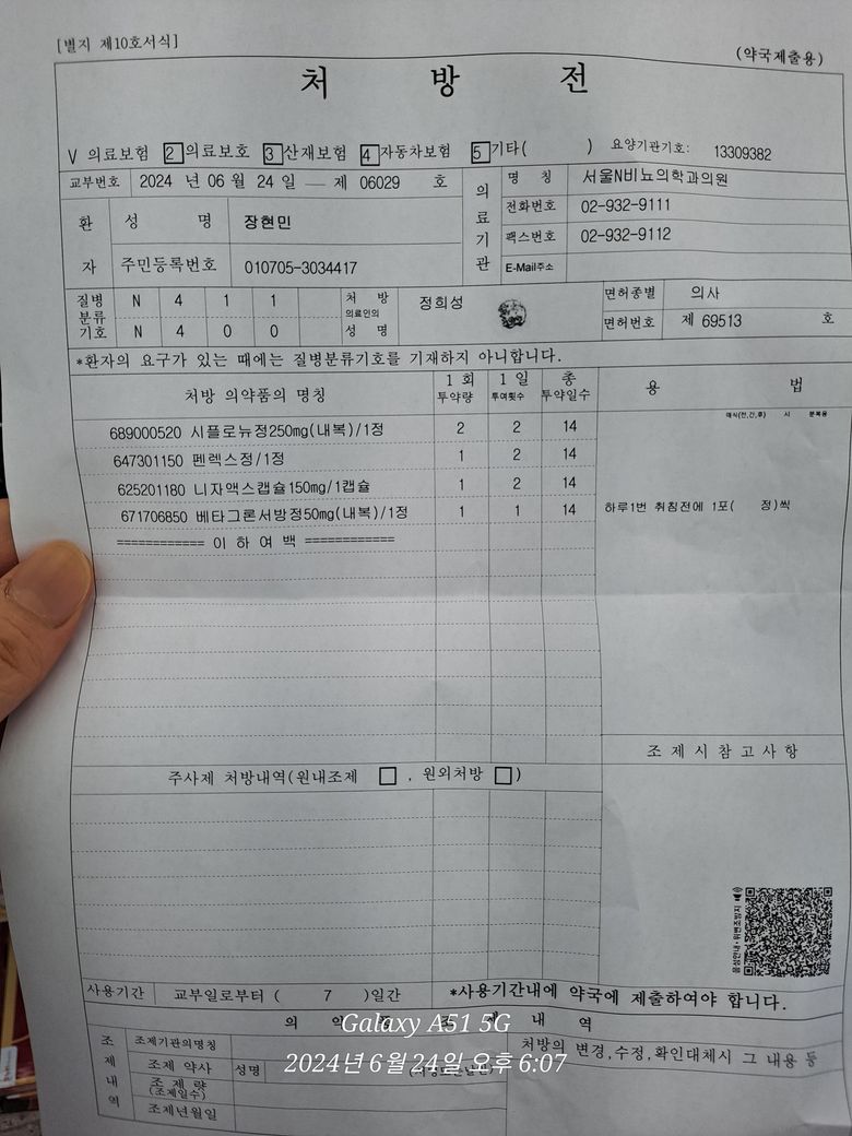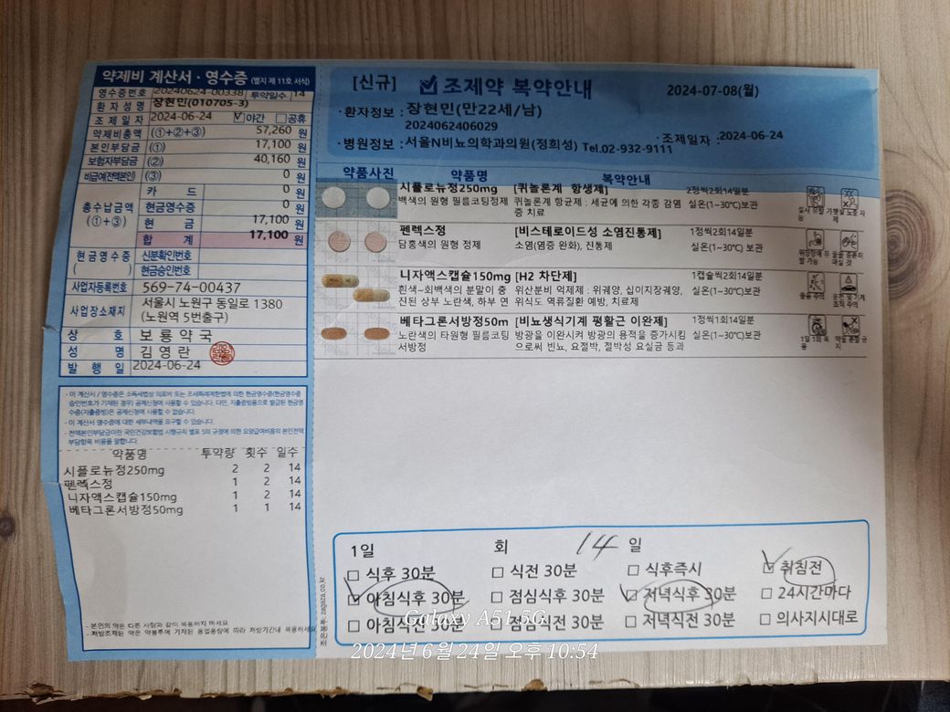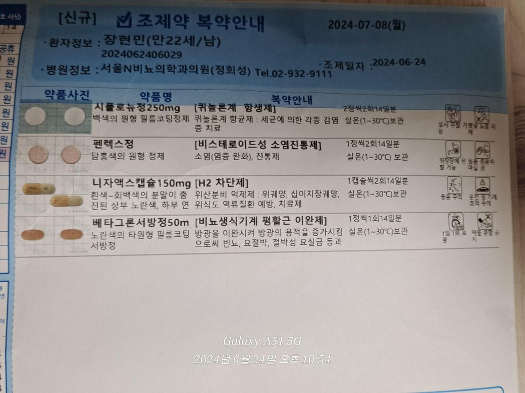 제가 오늘 노원에 있는 서울 N 비뇨기과 의원에서 진료를 받고 보룡 약국에서 항생제 14일치를 처방을 받았습니다. 총 3번 아침 식후, 저녁 식후, 그리고 자기 전에. 복용을 해야하는 약들을 처방을 받았습니다.
