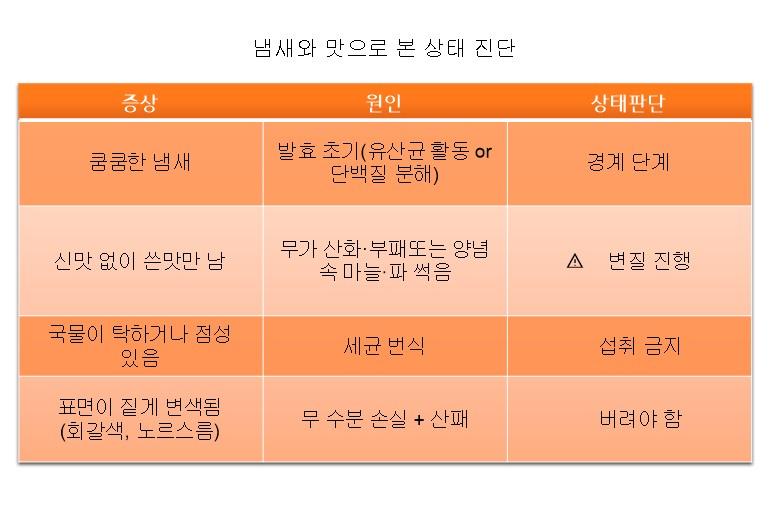 무생채에서 신맛 없이 쓴맛이 난다면 발효가 제대로 진행되지 않았을 가능성이 높습니다. 냉장 보관 중에도 수분이 빠지거나 산소가 닿으면 산패나 부패가 시작될 수 있습니다. 특히 쓴맛이 나면서 특유의 발효 냄새가 강하게 느껴진다면 이미 일부 변질된 상태일 수 있어 섭취를 중단하는 것이 안전합니다. 겉보기에는 멀쩡해 보여도 미생물 증식이 진행 중일 수 있으니 버리는 게 좋습니다.