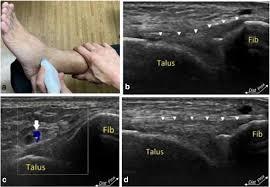 1. 초음파에서 발목 인대(특히 전거비인대 ATFL)가 보이는 위치: 발목 초음파의 전형적 구조는 다음과 같이 보입니다.