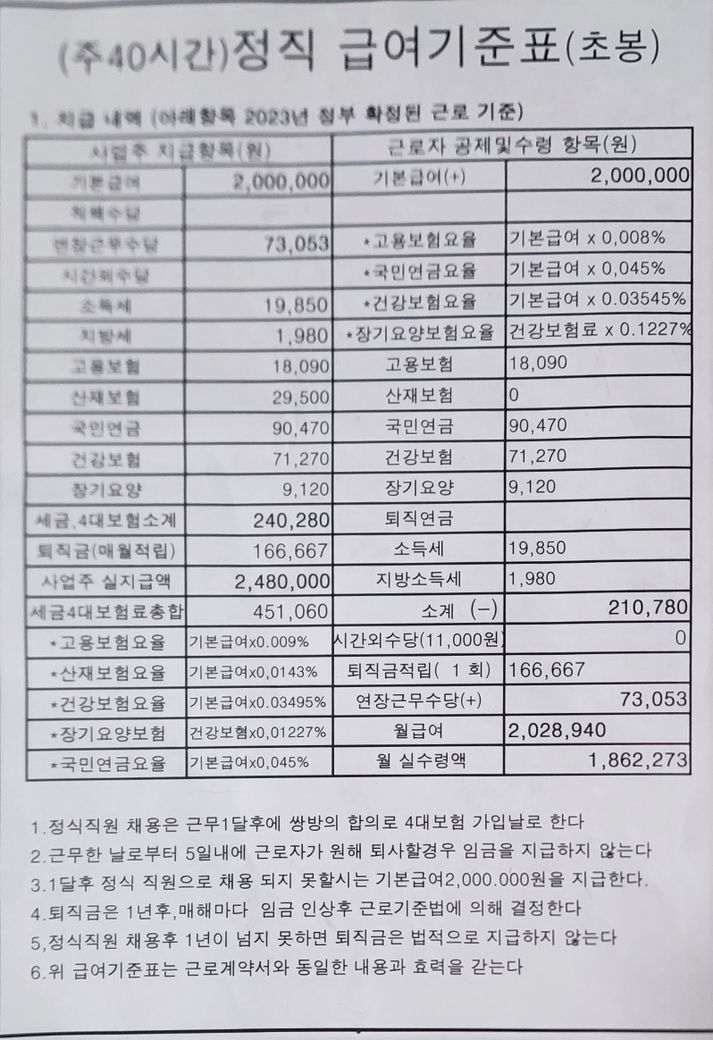 한주 48시간 근무하는 급여기준표의 경우 법에 따라 산정한 금액에 미달하는 것으로 보입니다. 5인이상 사업장에서 한주