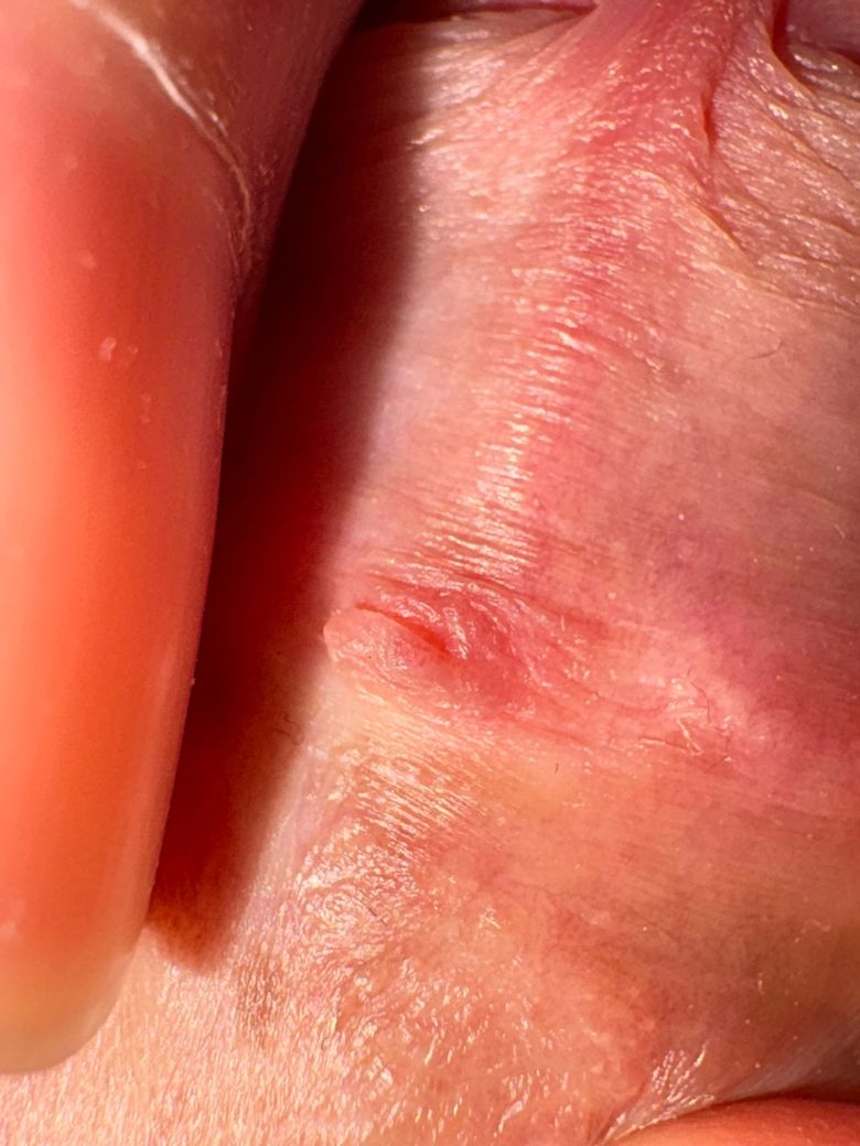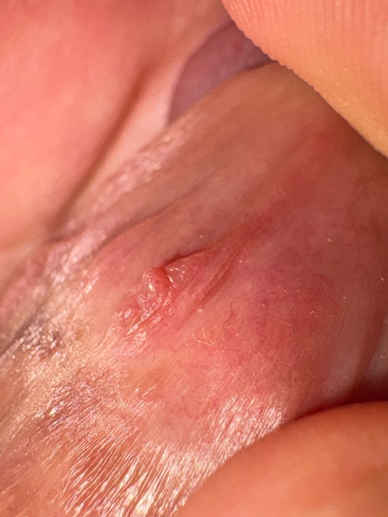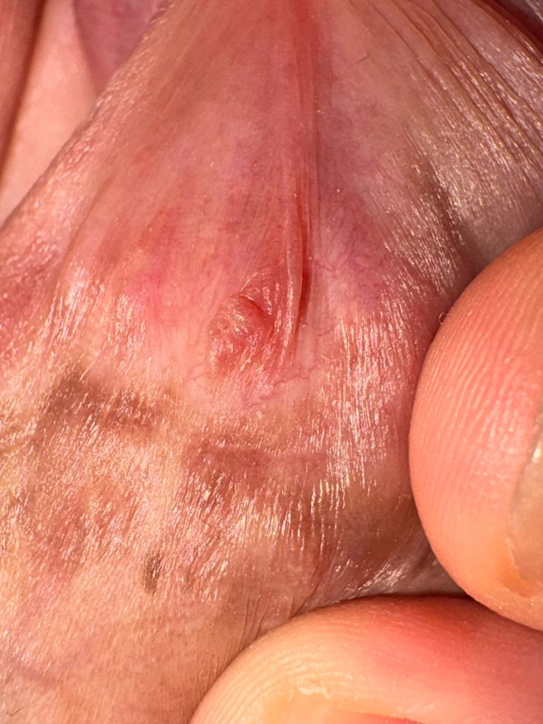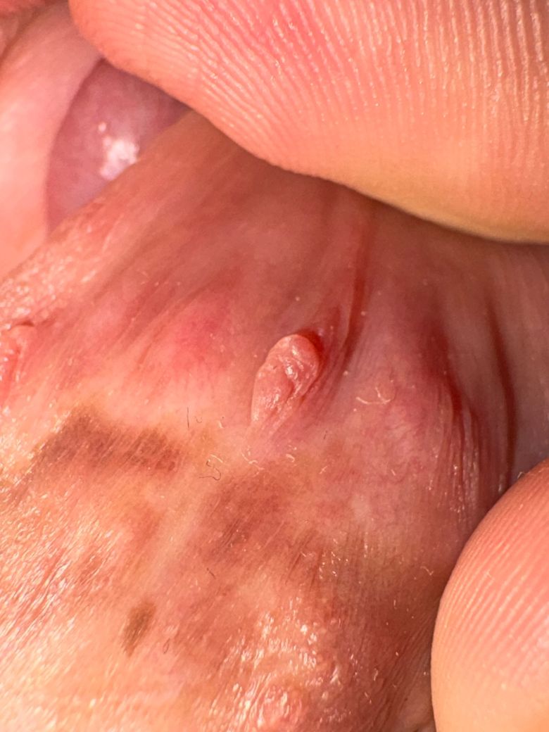 사진 소견상 포피소대 인접 부위에 작은 돌기성 병변이 관찰되지만, 표면이 매끈하고 색조가 주변 점막과 유사하며 군집성 혹은 사마귀 특유의 거친 표면은 뚜렷하지 않습니다. 형태만 놓고 보면 전형적인 곤지름(인유두종바이러스 감염)보다는 정상 변이 혹은 수술 후 반흔 조직, 또는 소대 주변에 흔히 보이는 생리적 돌기 가능성이 더 높습니다.