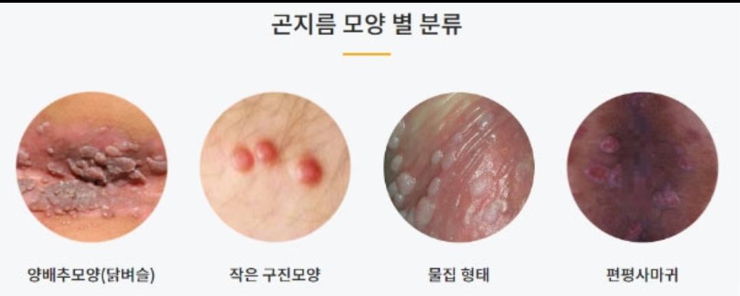 곤지름을 의심하는 주요 근거는 1) 표면이 울퉁불퉁하고 꽃양배추처럼 보이는 경우, 2) 점차 크기 증가 또는 개수 증가, 3) 군집 형태, 4) 최근 위험 성접촉 병력입니다. 현재 사진에서는 이런 전형적인 형태적 특징이 뚜렷하지 않습니다.