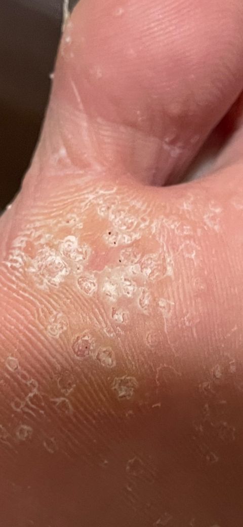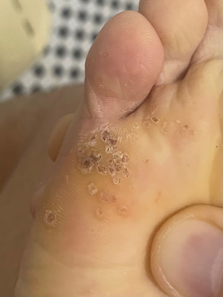 정리하면, 현재 양상은 사마귀 가능성이 높고 단순 세균성 각질융해증과는 다른 질환입니다. 피부과에서 냉동치료 여부를 포함해 치료 계획을 잡는 것이 적절합니다.