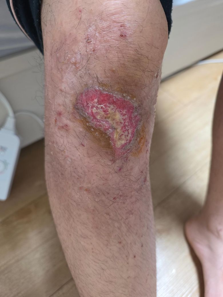 사진상으로는 보았을때 상처가 굉장히 크고 심하게 다치신것으로 보이며 집에서 관리하기 어려운 감염진행 또는 습윤 자극성피부염 등의 가능성도 존재합니다.