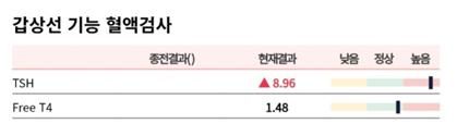검사 결과상 TSH가 8.96으로 상승되어 있고 Free T4는 정상 범위에 있어, 현재 상태는 아임상 갑상선기능저하증에 해당합니다. 이는 갑상선 호르몬 수치는 아직 정상으로 유지되고 있지만, 이를 유지하기 위해 뇌하수체에서 TSH를 더 많이 분비하는 초기 단계의 기능 저하 상태로 해석됩니다.