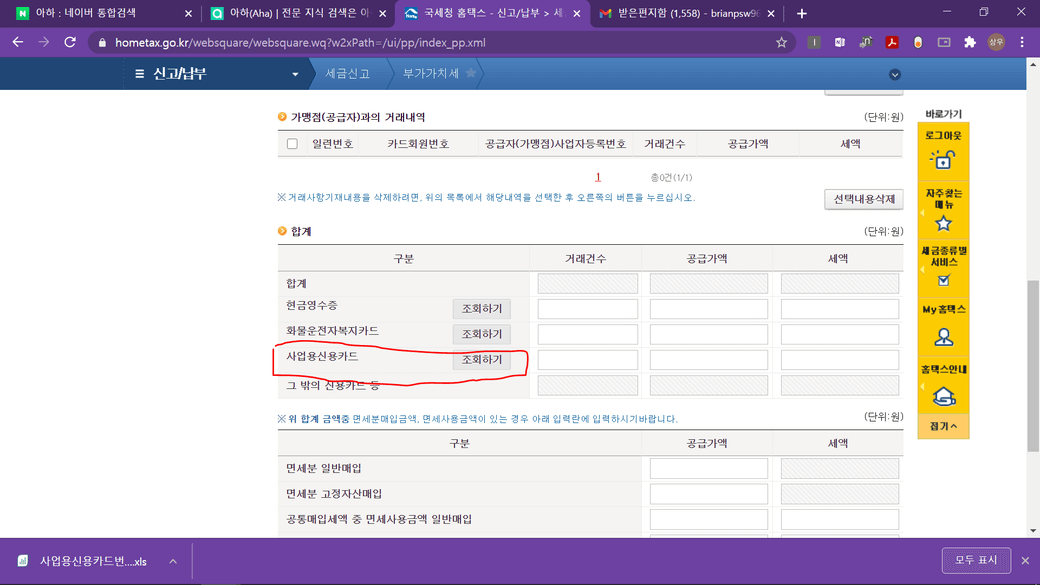 저희 가게는 매입결제수단 중 현금영수증이나 화물운전자복지카드는 없어서 사업용신용카드 작성하고자 조회하기를 눌렀습니다.