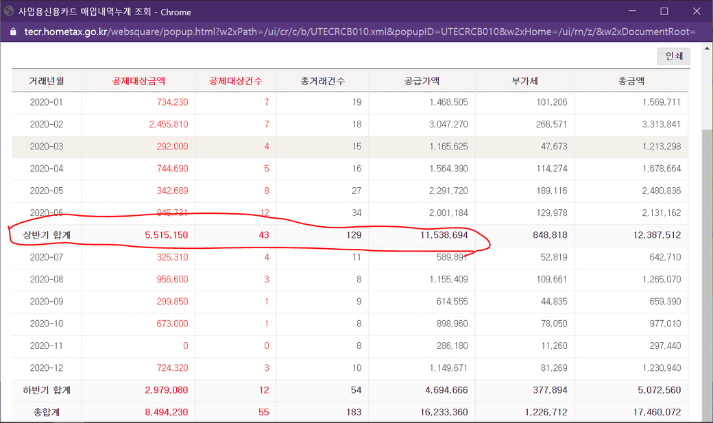 1)위 화면이 나오는데 이곳에 있는 상반기 합계 금액들 중 어떤 숫자를 적어야 합니까?