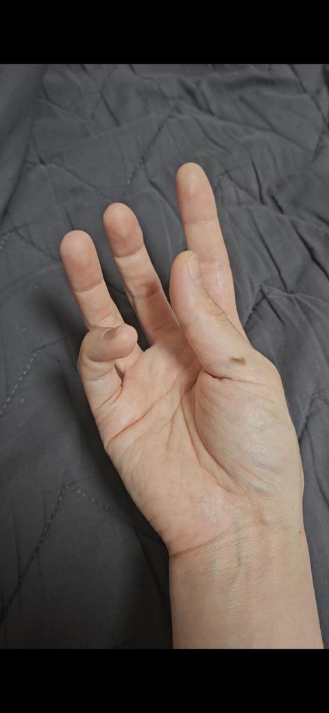 사진과 같은 상태에서 엄지손가락 근육 부분은 뻣뻣하고 손가락은 좌우로 떨립니다
