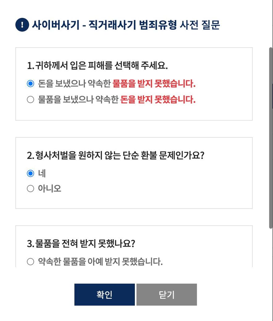 당근마켓에서 사기를 당해 사이버수사대에 온라인 접수 중인데, 2번 문항에서 막혀 고민 중입니다.