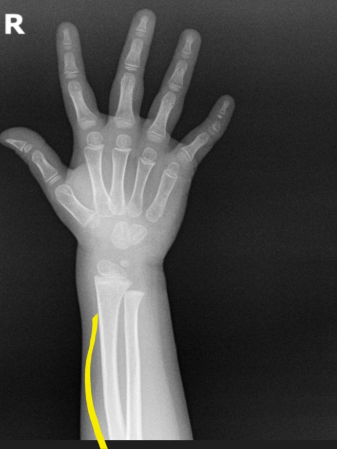 해당 부위는 요골이라는 뼈로, 일반적으로 약간의 곡선 형태를 띄는 경우가 많은 뼈입니다. 크게 걱정하지 않으셔도 될 것으로 보입니다.