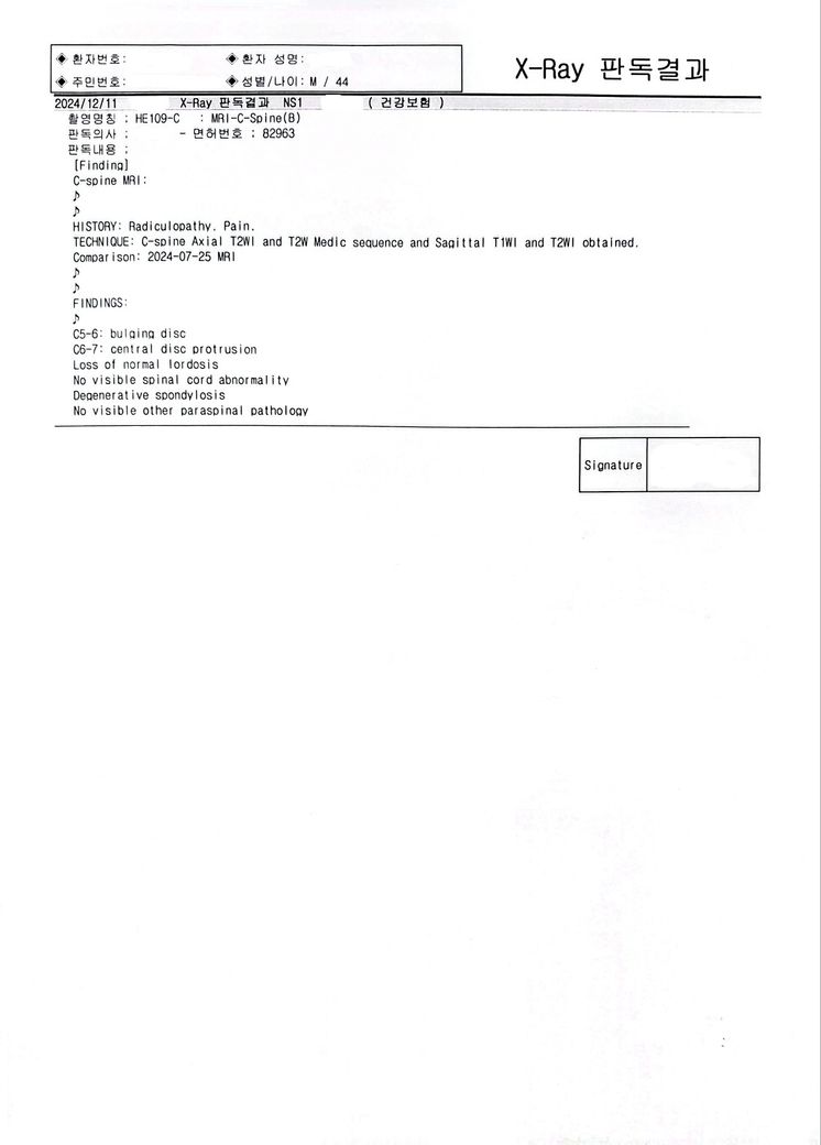 MRI 촬영 결과 경추5~6번에서 볼록 디스크와 경추6~7번 디스크에서 중앙 디스크 탈출이 확인되고 신경근의 압박이 있을 수 있고, 정상적인 경추 곡선이 소실 되어 있는 상태로 근육의 긴장이나 자세 등의 문제가 나타날 수 있다고 합니다.