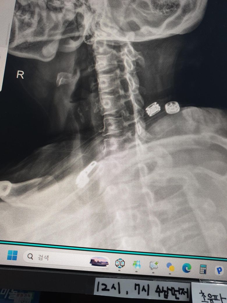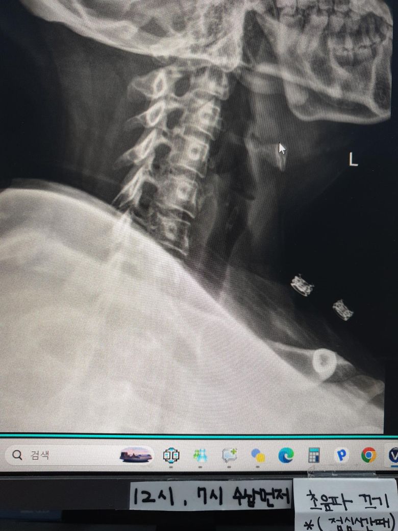 엑스레이 사진을 보니 일자목 경향이 보이며 이로인해 목 뒤쪽 근육과 후두신경이 계속 긴장해 통증이 발생하는것으로 보입니다. 옆으로 누워 주무시는에 어깨가 말려있다면 어깨 높이를 충분히 받쳐주어 목이 아래로 꺾이지 않도록 유도하는 베개가 필수입니다. 4만원대 예산이라면 메모리폼이나 엘라스틱 소재의 경추형 베개중에서도 양옆이 가운데보다 높은 디자인이 좋습니다. 너무 말랑한것보다는 탄성이 있는 제품이 신경눌림 방지에더 효과적이며, 수건을 말아 목뒤에 받쳐보며 본인에게 맞는 높이를 먼저 테스트해보는것이 좋습니다. 답변이도움됐길 바랍니다!