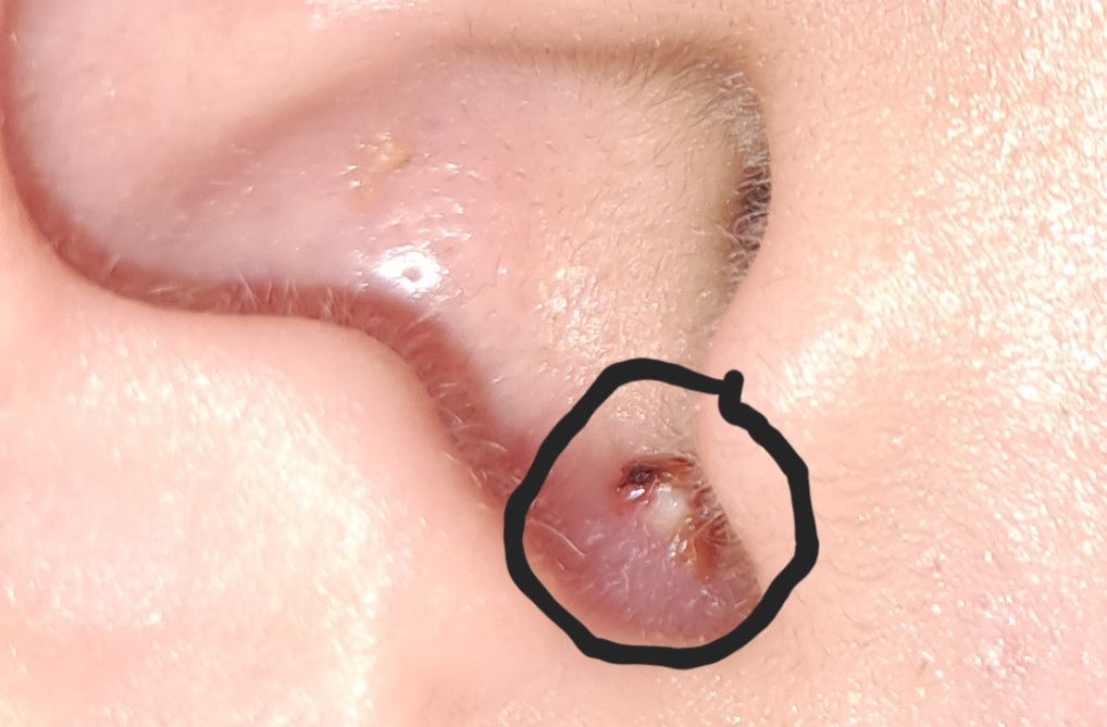 모낭염과 같은 피부질환으로 보이며 고름집을 형성한 상태라 보입니다. 염증이 잘 가라앉지 않는다면 가까운 피부과나 이비인후과를 방문하시기 바랍니다.