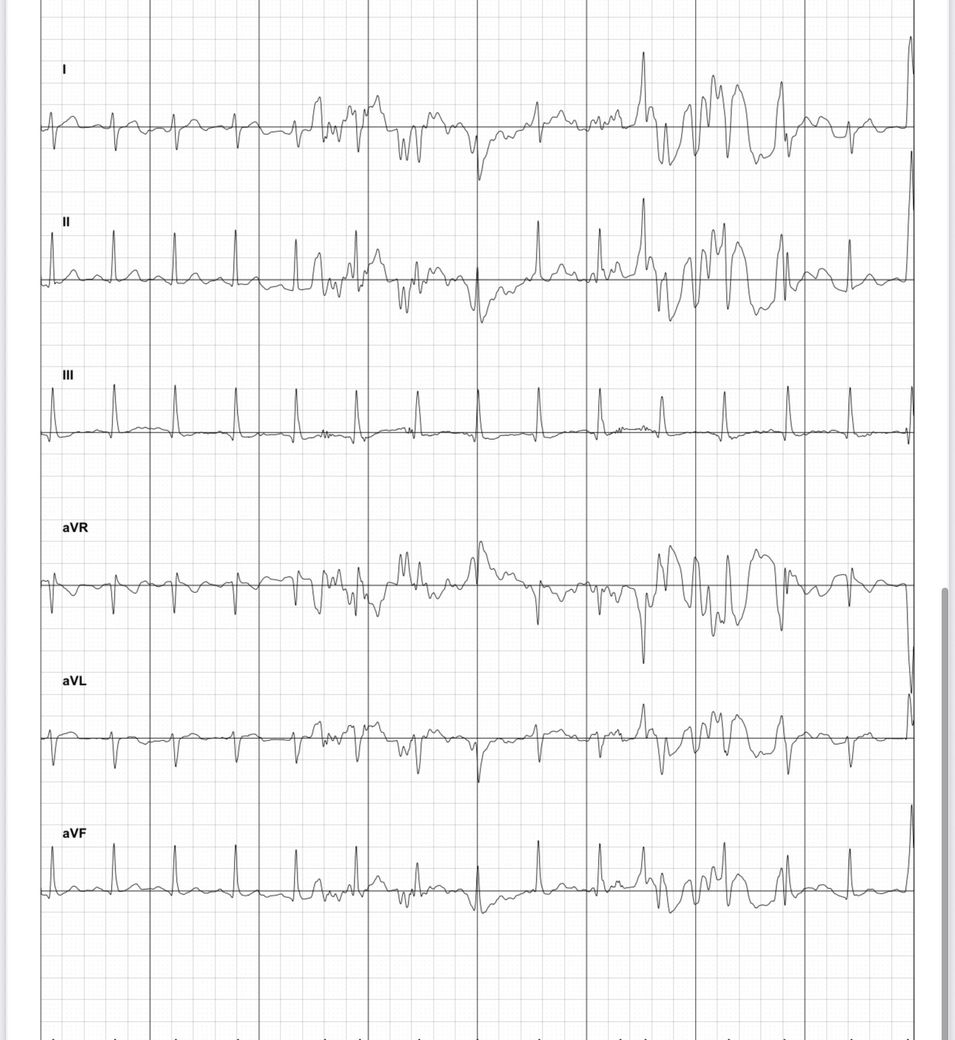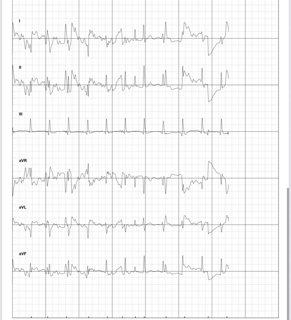 6리드 양손가락하고 왼쪽 발목 갖다대는 심전도 기기에서 측정한건데 엄청 날뛰는 형태로 나와서 분석좀 해주세요 빈맥인지 심방세동인지 모르겠습니다