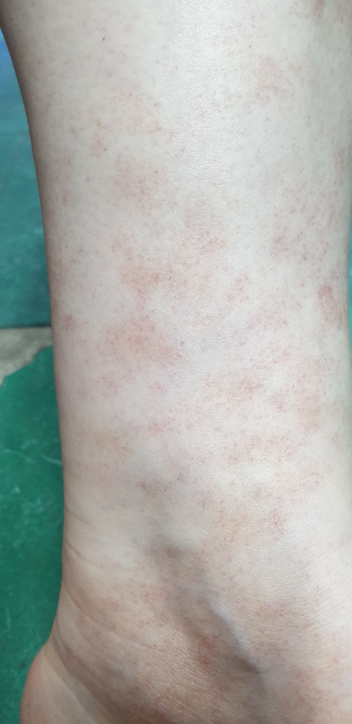 해당 병변은 점상출혈과 감별이 필요해 보이나 사진상으로는 발진의 양상이 출혈보다는 피부 발진에 가까워 보입니다. 발진은 최근 바이러스 감염이나 다른 감염성 질환으로 인해 발생할 수도 있어 피부과에 내원하시어 진료를 받아보시는 것이 좋겠습니다.