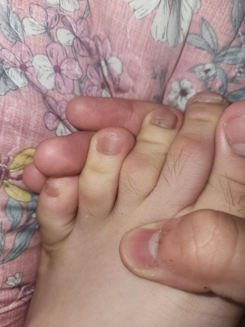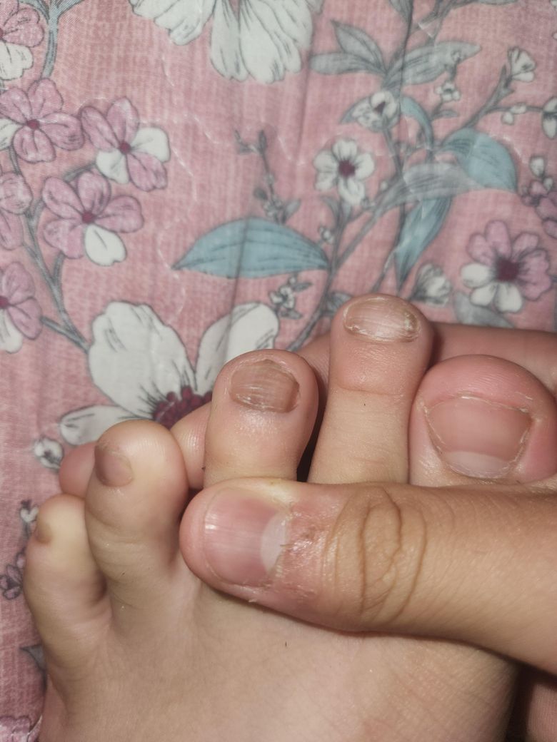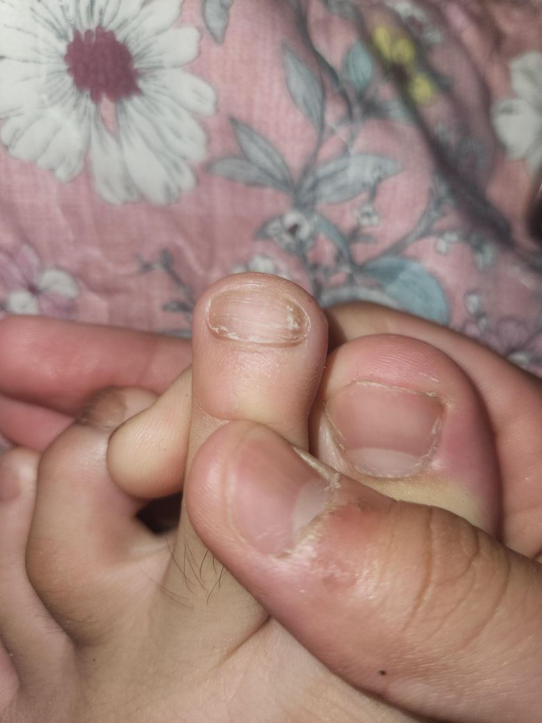 왼쪽 2번 3번 4번 발가락에 검은줄이 생겼습니다. 처음은 중간발까락에만 있었지만 점점 번졌습니다. 현재 가운데 발가락은 큐티클깨지 색이 변했삽니다